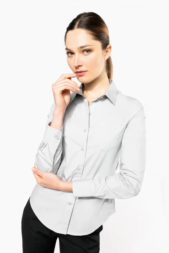 Col. non boutonné. Boutons ton sur ton. Poche poitrine côté gauche en V. Poignet réglable à angles arrondis avec patte de manche indéchirable. 1 bouton de rappel. Bas. arrondi.