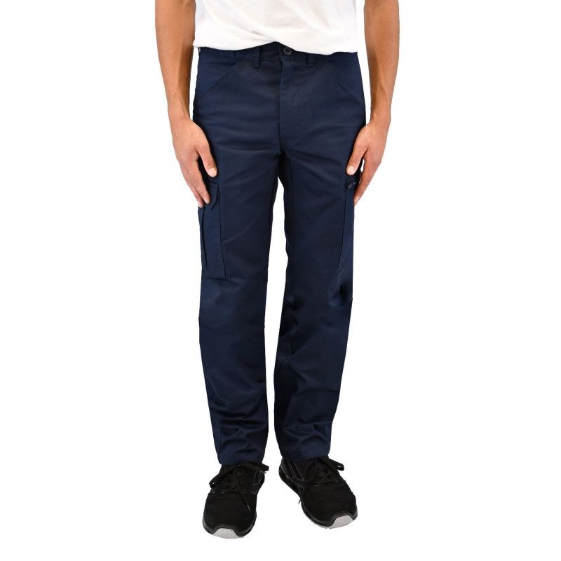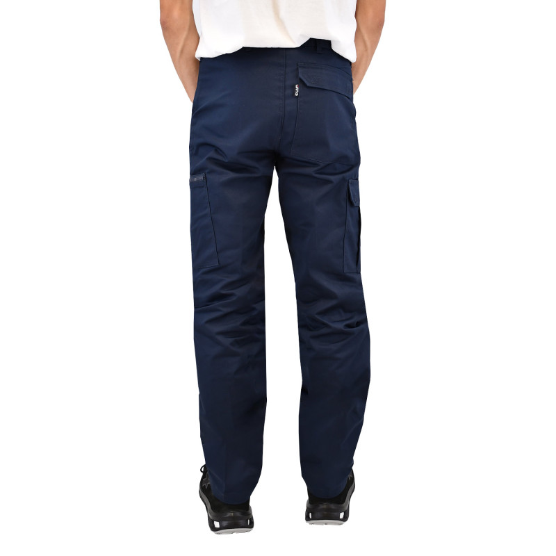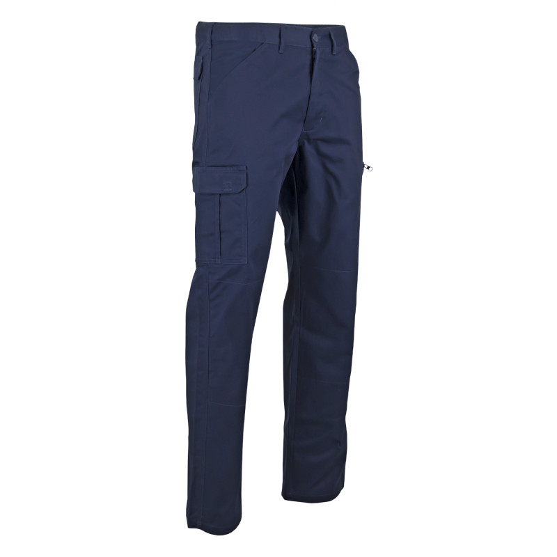 Ceinture élastiquée sur les côtés avec 5 passants. Braguette zippée + bouton. 2 poches italiennes. 1 poche cuisse fermée par un rabat avec auto-agrippant à droite. 1 poche cuisse zippées à gauche. 1 poche dos avec rabat.